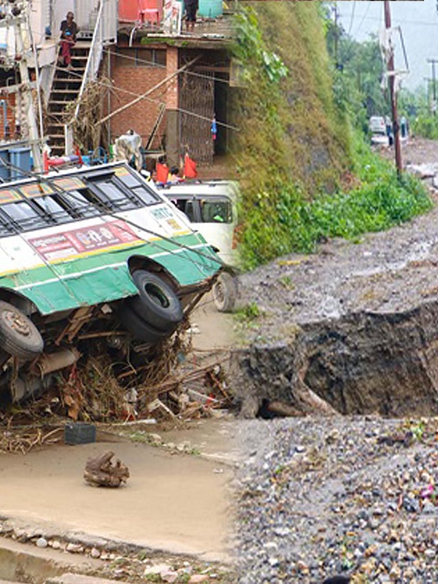 ہماچل روڈ ٹرانسپورٹ کی ایک بس بادل پھٹنے کے بعد دھرم پور (منڈی) میں پانی اور مٹی کے سیلاب سے متاثر۔