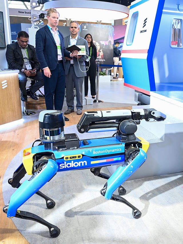 یشو بھومی میں منعقد انڈیا موبائل کانگریس 2025 میں نمائش کے لیے رکھا گیا ایک جدید روبوٹ