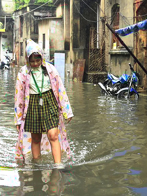 گھٹنوں تک پانی میں ڈوبی سڑک پر چلتے مقامی افراد