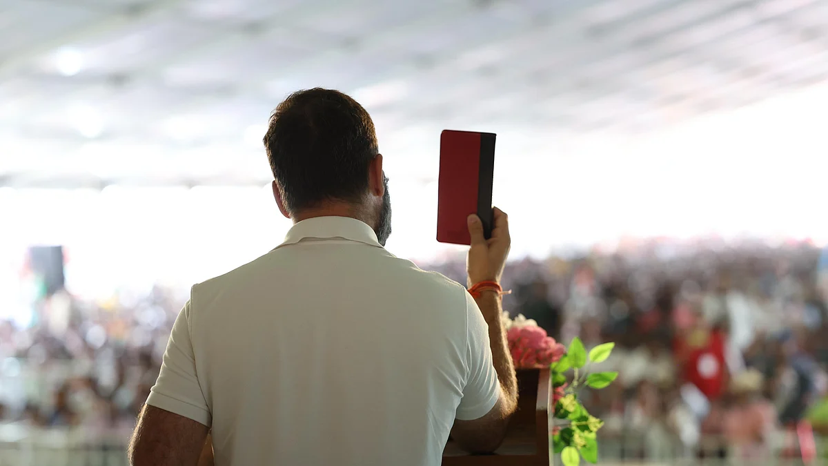 راہل گاندھی نے جھارکھنڈ کے کونبیر میں ایک جلسۂ عام سے خطاب کرتے ہوئے کہا کہ ’’آئین کی حفاظت کے لیے ہم جان کی بازی لگا دیں گے، ہر قیمت پر آئین اور عوام کے حقوق کی حفاظت کریں گے۔‘‘
