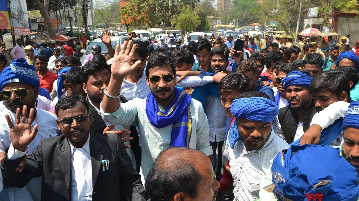 وارانسی: وزیر اعظم نریندر مودی کے خلاف انتخابی میدان میں تال ٹھوکنے کے ارادے سے تہذیبی شہر وارانسی آئے بھیم آرمی کے فاؤنڈر چندر شیکھر آزاد نے سنیچر کو ہاتھوں میں ’’ہندوستانی آئین کی کاپی‘‘ لیکر تقریباً 14 کلو میٹر لمبا روڈ شو کیا۔